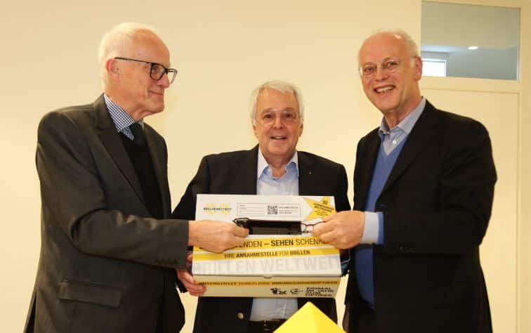 Anfang Januar übergaben Rudolf Scharping (rechts) und Jürgen Rüttgers ihre Brillen; in der Mitte Carlo Wagner (Bild: Brillen Weltweit)