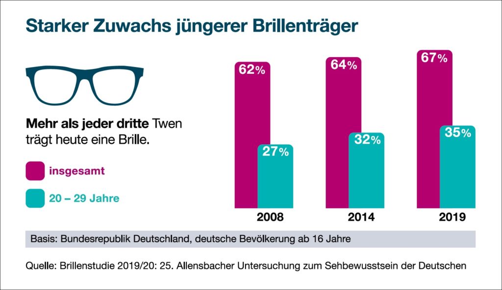 Gute Aussichten für die Branche: Die Zahl der Brillenträger nimmt immer mehr zu, jetzt sind es schon zwei von drei Erwachsenen, die eine Brille tragen. Laut der jüngst veröffentlichten Allensbach-Brillenstudie 2019/20 ist die Zahl der Brillenträger in Deutschland (ab 16 Jahren) in den vergangenen fünf Jahren auf 41,1 Millionen gestiegen. Überdurchschnittlich starke Zuwächse gab es dabei in den Gruppen der 20- bis 29-Jährigen (plus vier Prozentpunkte) sowie der 30- bis 44-Jährigen (plus sechs Prozentpunkte). [ID 12618]