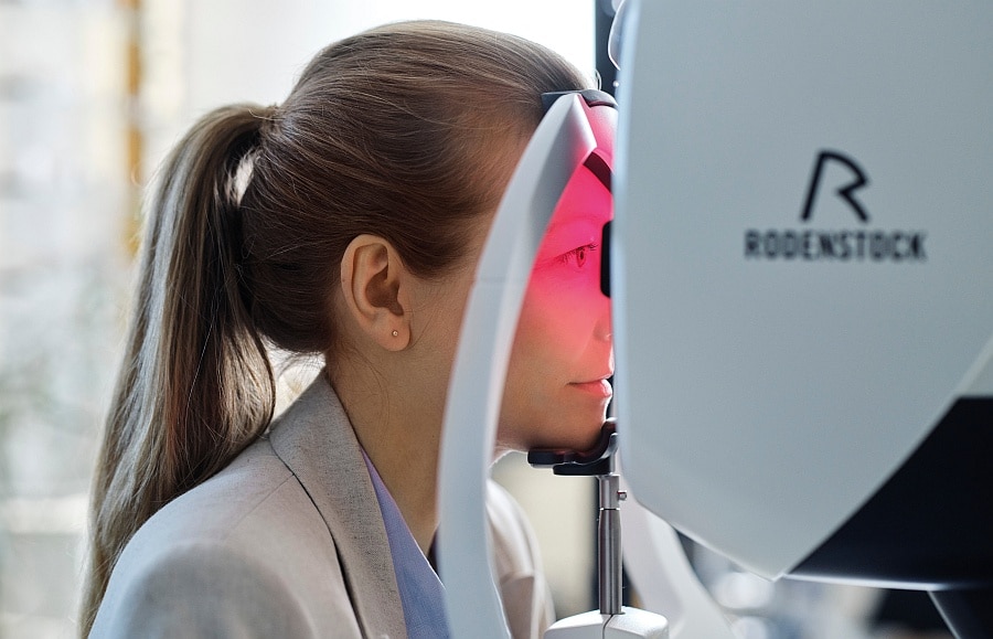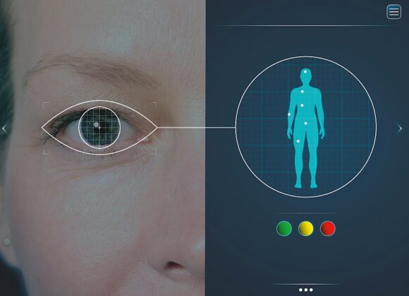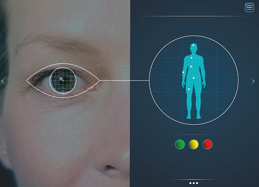 Der DNEye-3-Scanner hat mich also schon im Visier, noch ehe ich mich auf den Hocker vor dem Gerät richtig platziert habe. Vor der Messung mit dem Scanner muss dieser einmal manuell justiert und auf meine Augen ausgerichtet werden, in der Folge läuft alles vollautomatisch nacheinander ab. Ich bestätige noch kurz, dass ich auch die zumindest für mich unangenehme Prüfung des Augeninnendrucks im Rahmen des sich direkt anschließenden Eye Care Checks wünsche – schon geht sie los die nicht allzu wilde Fahrt.