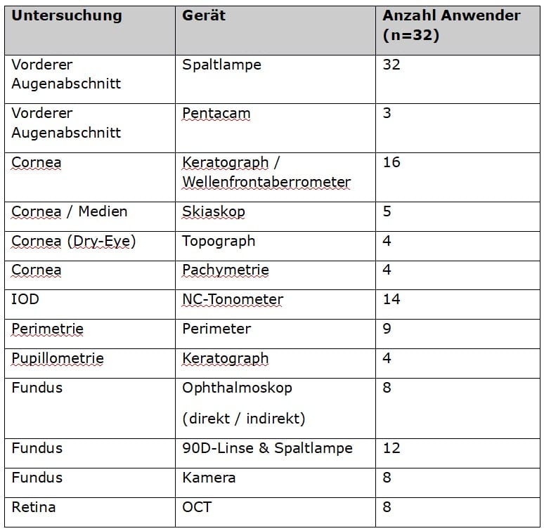 Platz eins besetzt die Beurteilung des vorderen Augenabschnitts via Spaltlampe. Weiter die Fundusbeurteilung via Ophalmoskop und/oder der 90D-Linse. Nachfolgend eine Aufstellung der populärsten Untersuchungen und die Geräte, die genutzt werden: