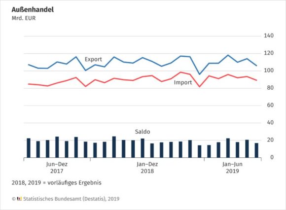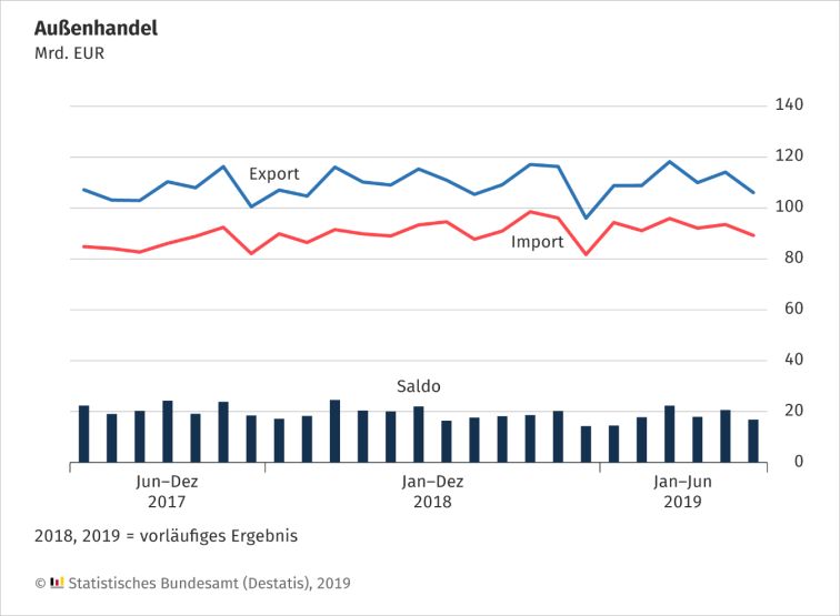 Die Außenhandelsbilanz schloss im Juni 2019 mit einem Überschuss von 16,8 Milliarden Euro ab. Im Juni 2018 hatte der Saldo in der Außenhandelsbilanz +22,0 Milliarden Euro betragen. Kalender- und saisonbereinigt lag der Überschuss der Außenhandelsbilanz im Juni 2019 bei 18,1 Milliarden Euro.