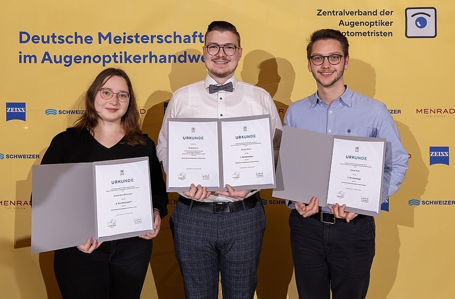 Die Augenoptiker-Bundessieger 2023 (von links): Alexandra Schumann (zweite Bundessiegerin aus Sachsen-Anhalt), Rudolf Amm (erster Bundessieger aus Sachsen und Gewinner des Wettbewerbs „Die gute Form im Handwerk – Handwerker gestalten“) und Niklas Kühl (dritter Bundessieger aus Schleswig-Holstein) (Bild: ZVA/ Peter Magner)