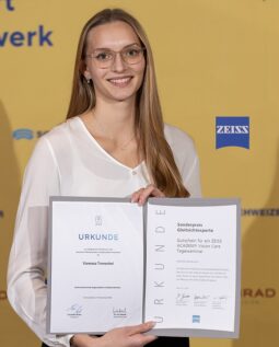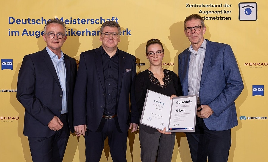 Sonderpreis „Gleitsichts-Experte“: Die Firma Zeiss Vision sponserte der Gleitsicht-Expertin Vanessa Trenschel bei der Verleihung des gleichnamigen Sonderpreises einen Gutschein für ein Tagesseminar im Wert von 490 Euro. Damit wurde die hervorragende Leistung der 19-Jährigen aus Hessen an der Prüfungsstation „Reklamations-Management Gleitsichtglas“ prämiert.