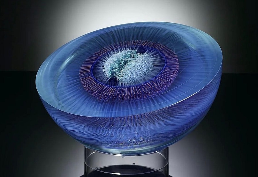 Unter den Preisträgern 2023 wurde auch Wilfried Grootens aus Kleve für den Bereich Objekt ausgezeichnet. Die faszinierenden Objekte des Glaskünstlers erinnern nicht selten an Augen und Iris. So auch das mit dem Manufactum ausgezeichnete Objekt „Closed Vessel“ („Geschlossenes Gefäß“, Optifloat lackiert geklebt poliert).