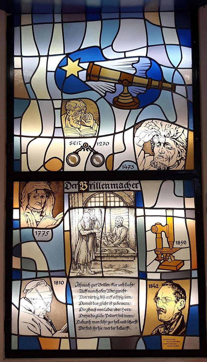 „Im Eingangsbereich des Geschäftes Optik Boelke in Bad Nauheim steht man einem bunten Glasfenster gegenüber. Es zeigt die Geschichte der Brille und wurde von dem bekannten Nauheimer Künstler Otto Franz Kutscher gemalt. Brillenglas und Glaskunst liegen hier eng beieinander.