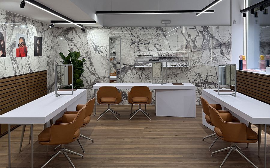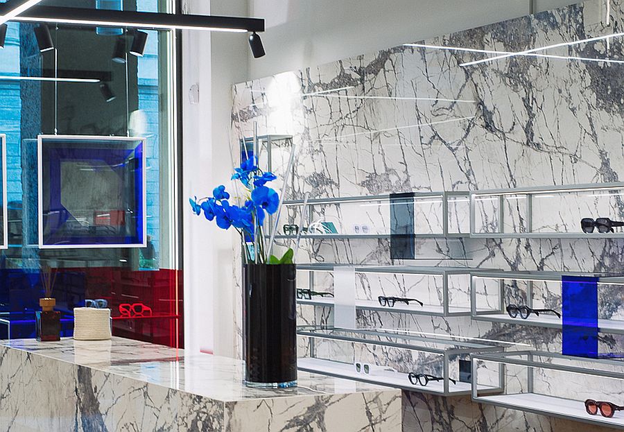 Die 88 qm große Fläche wurde mit einer neuen zeitgemäßen Ästhetik neu gestaltet, wobei die Funktionalität und Effizienz des Interieurs verbessert und der Kunde in den Mittelpunkt gestellt wurde, der eingeladen ist, eine helle und harmonische Atmosphäre zu erleben. Zu den Innenausstattungs-Merkmalen gehören edle Eichenvertäfelungen, filigrane Marmor-Oberflächen, eine auffällige Brillen-Auslage aus leichtem lackiertem Stahl mit integrierten LED-Streifen und vertikalen Spiegeln sowie luxuriöse Ledersessel von Flexform.