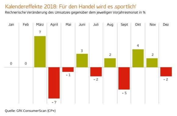 Durch die Verschiebung des beweglichen Osterfestes vom 16. April 2017 auf den 1. April 2018 (jeweils Ostersonntag) rutscht das Ostergeschäft mitsamt der einkaufsstarken Karwoche diesmal komplett in den März. Dadurch sind für den Handel im März 2018 gegenüber dem Vorjahr sieben Prozent mehr Umsatz drin – theoretisch. Denn so nahe der tatsächliche Einkaufseffekt dem rechnerischen Kalendereffekt aller Erfahrung nach fast durchweg kommt, ein Automatismus ist dieser Zusammenhang nicht. Allein deshalb, weil mehr Zeit zum Einkaufen ist, kaufen die Verbraucher noch nicht unbedingt mehr ein. Das gilt für die typischen Saisonartikel, erst recht aber für den ‚normalen‘ Einkauf. Und dann wäre da auch noch die Konkurrenz, die ja sprichwörtlich ‚nicht schläft‘.