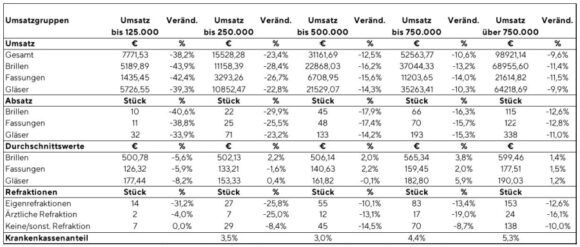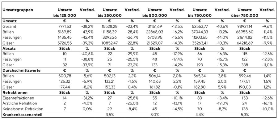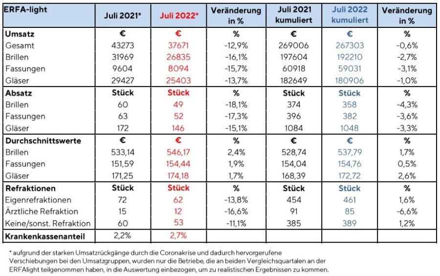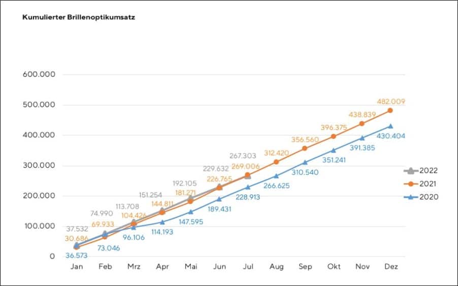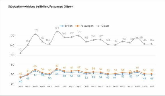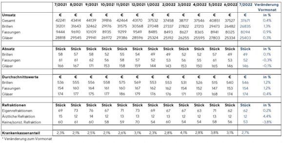 Der Anteil des Umsatzes mit Krankenkassen beläuft sich laut ERFA-light-Auswertung im Juli 2022 auf 2,7 Prozent. Der kumulierte Umsatz bis Juli 2022 ist bezogen auf das Vorjahr leicht negativ. Bei den Brillenstückzahlen ist laut ZVA kumuliert ein Rückgang von 4,3 Prozent festzustellen.