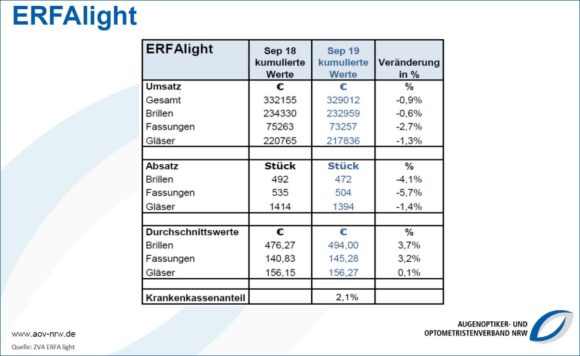 Grafik 1: Erfa light, kumulierte Kennzahlen von September 2018 und 2019 im Überblick. Quelle ist eine nicht repräsentative Stichprobe von 250 bis 300 unabhängigen Betrieben, die der ZVA regelmäßig ermittelt (Quelle: Blick. 2019)