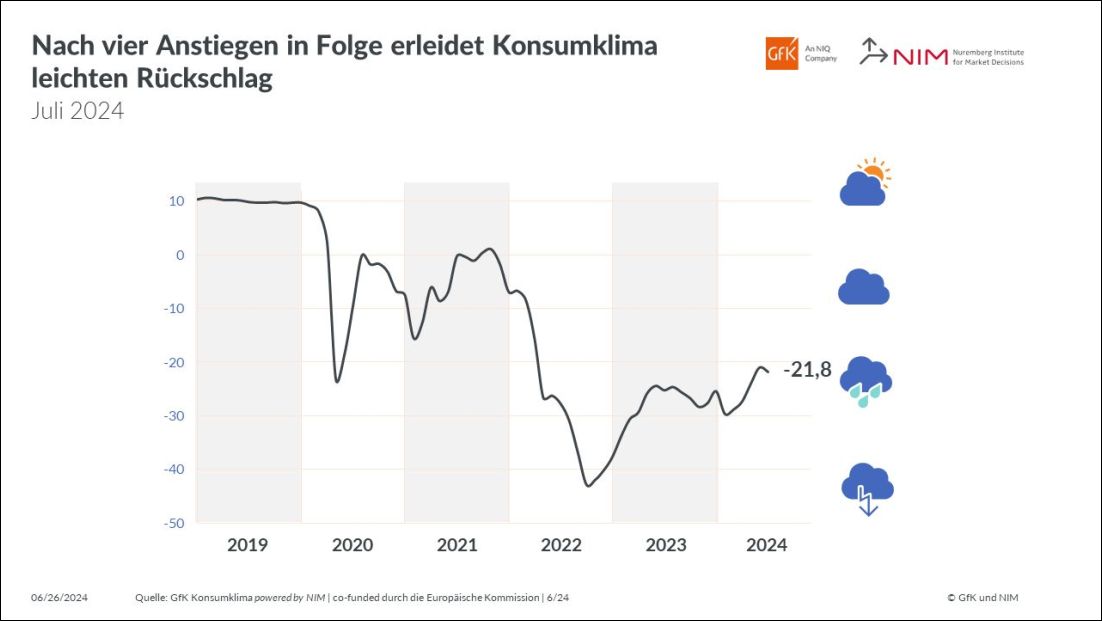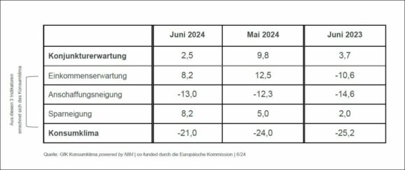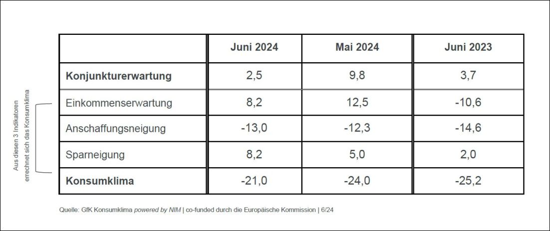 Neben den etwas rückläufigen Einkommens-Aussichten sei dafür vor allem die Sparneigung verantwortlich, die im Juni um 3,2 Punkte auf 8,2 Punkte ansteigt. Dies zeigten die aktuellen Ergebnisse des GfK Konsumklima powered by NIM. Es wird seit Oktober 2023 gemeinsam von GfK und dem Nürnberg Institut für Marktentscheidungen (NIM), Gründer der GfK, herausgegeben.