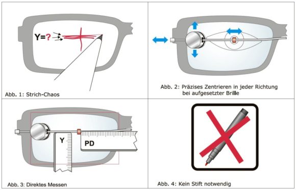 Der Kunde muss die Brille wiederholt auf- und absetzen, das Hantieren des Augenoptikers mit dem Stift in Augennähe ist ihm unangenehm und das „freihändige Malen“ wirkt eher unprofessionell, vor allem wenn man ihm vorher noch die Hightech-Eigenschaften des Brillenglases erläutert hat.