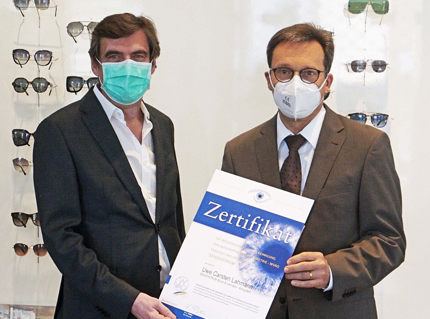 Auch durch Covid 19 nicht zu stoppen: Optometrist Uwe Lahmann (rechts) freut sich über die erneute Auszeichnung mit dem Gütesiegel „Sehzentrum“ durch WVAO-Geschäftsführer RA Hartmut Glaser