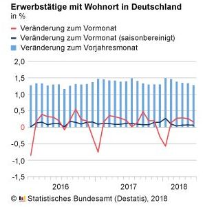 Im Vormonatsvergleich stieg die Zahl der Erwerbstätigen nach vorläufigen Ergebnissen der Erwerbstätigenrechnung im Juni 2018 um 71.000 Personen oder 0,2%. Der Zuwachs gegenüber dem Vormonat war identisch mit dem Durchschnitt der letzten fünf Jahre. Saisonbereinigt, das heißt nach rechnerischer Ausschaltung der üblichen jahreszeitlich bedingten Schwankungen, stieg die Erwerbstätigenzahl im Juni 2018 gegenüber Mai 2018 um 28.000 Personen oder 0,1%.