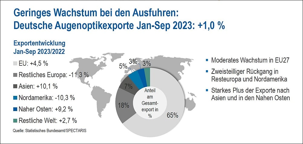 Die Exportstatistik zeigt für die ersten drei Quartale 2023 bei den Ausfuhren in Länder der Europäischen Union ein Plus von 4,5 Prozent, auf die mit 65 Prozent fast zwei Drittel der Exporte entfallen. Die Ausfuhren nach Asien legten deutlich zu (+10,1 Prozent), während sich die Exporte nach Nordamerika (–10,3 Prozent) abschwächten. Rückläufig entwickelten sich laut Spectaris 2023 auch die Ausfuhren in das restliche Europa (–11,3 Prozent).