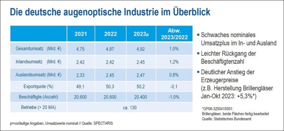 Der Industrieverband Spectaris mit Sitz in Berlin präsentierte zum Start der Fachmesse opti in München am 12. Januar erste Marktzahlen der deutschen Hersteller von Augenoptik und Consumer Optics für 2023. Demnach stieg der Umsatz um 1,0 Prozent auf 4,92 Mrd. Euro. Dabei seien wenig Impulse aus dem Auslands-Geschäft gekommen.