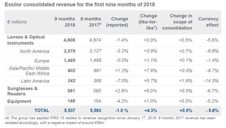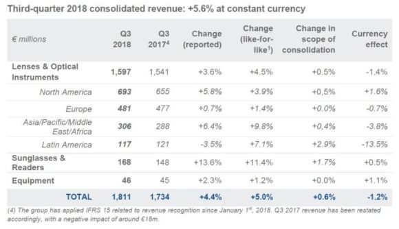 Neben Luxottica präsentierte auch Essilor seine Zahlen für das dritte Quartal. Zum 30. September 2018 betrug der Konzernumsatz von Essilor International 5,537 Mrd. €, währungsbereinigt ein Plus von 4,8%.