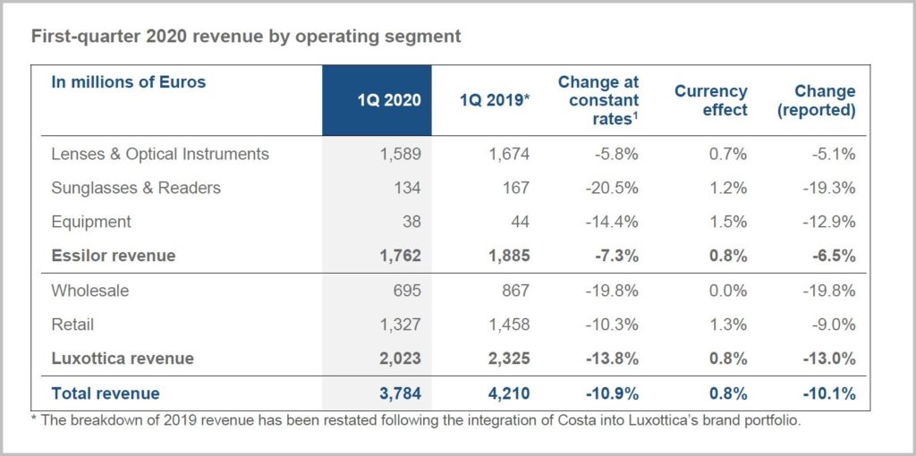 (Charenton-le-Pont, Frankreich) EssilorLuxottica gab Anfang Mai bekannt, dass der konsolidierte Umsatz für das erste Quartal 2020 sich auf 3.784 Millionen Euro belief, was einem Rückgang von 10,1% gegenüber dem Vorjahresquartal entspricht (-10,9% bei konstanten Wechselkursen) und eine gute Widerstandsfähigkeit in der aktuellen beispiellosen globalen Krise zeige.