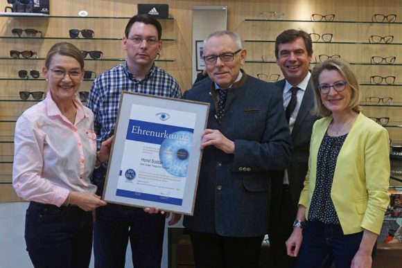 Augenoptiker Horst Soldan und sein Team vom Sehzentrum Optik Soldan durften sich freuen. Aus Anlass des zehnjährigen Sehzentrum-Jubiläums überreichte WVAO-Geschäftsführer RA Hartmut Glaser eine Ehrenurkunde der WVAO, die das besondere Engagement für das gesunde und gute Sehen des ganzen Teams im letzten Jahrzehnt würdigt.