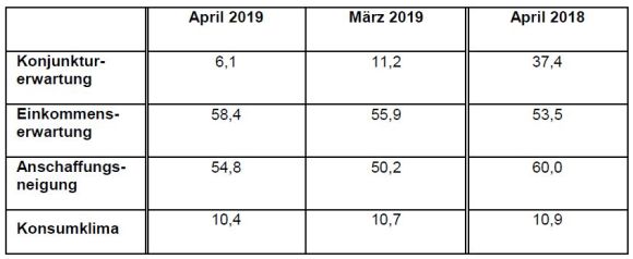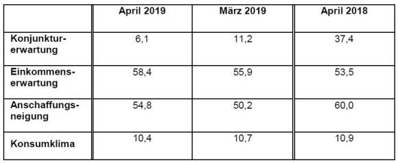 (Nürnberg) – Die Stimmung der Verbraucher zeigte im April 2019 insgesamt ein uneinheitliches Bild. Einkommenserwartung und Anschaffungsneigung hätten auf ohnehin hohem Niveau zugelegt, während die Konjunkturerwartung einen wesentlichen Teil ihrer Vormonatsgewinne wieder abgeben musste. Für Mai prognostiziert die Gesellschaft für Konsumforschung GfK für das Konsumklima einen Wert von 10,4 Punkten.