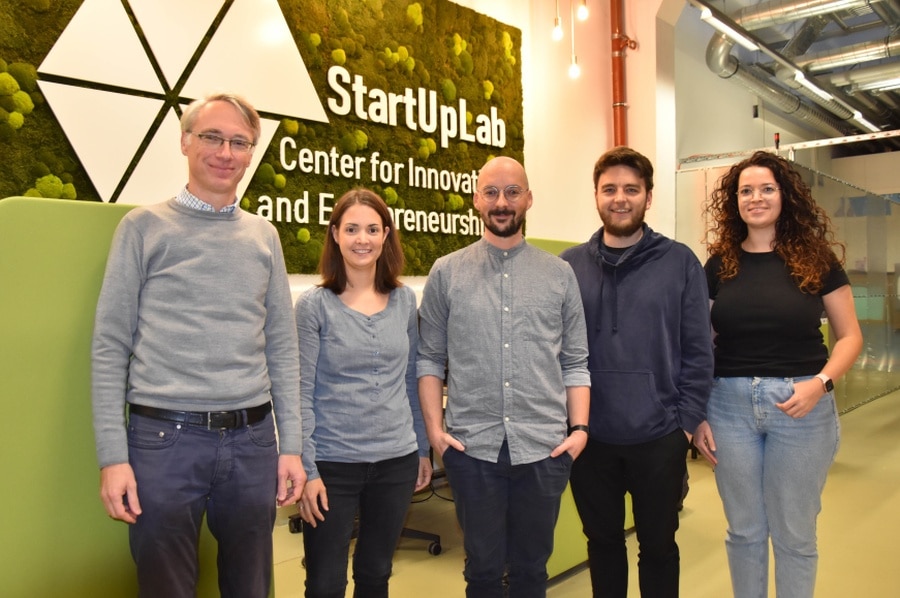 Vom Hörsaal der EAH Jena ins eigene Unternehmen (von links): André Kabeck (Gründungs-Service der EAH Jena), Dr. Ilka Urban, Dr. Markus Leicht und Nico Trinks (Team Perceptec; nicht auf dem Foto: Frank Nietzsche) und Michelle-Sharon Cole (Projekt „StartUp@EAH“) (Bild: Christina Nolte/ EAH Jena)