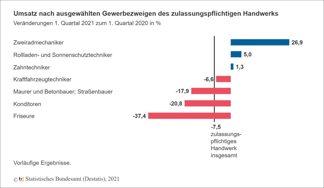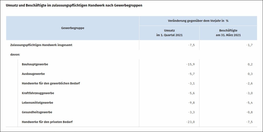In allen Gewerbegruppen im zulassungspflichtigen Handwerk wurden im 1. Quartal 2021 niedrigere Umsätze als im Vorjahresquartal erwirtschaftet. Dabei seit laut Destatis zu berücksichtigen, dass Einschränkungen aufgrund der Corona-Pandemie erst am Ende des 1. Quartals 2020 begannen und die Ergebnisse des 1. Quartals 2020 davon noch kaum betroffen waren.