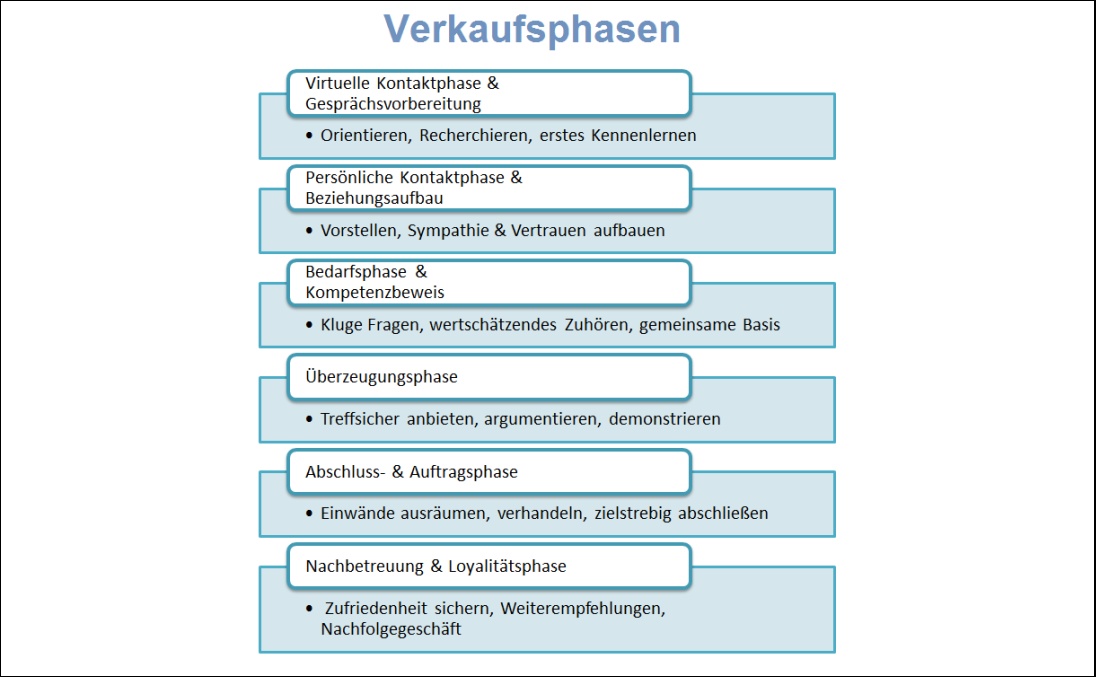 „Die Phasen des Verkaufsgesprächs“ (aus „Happy Sales“ von Sandra Schubert): Die Phasen 1-3 können auch im Rahmen eines virtuellen Meetings stattfinden, ebenso wie die Nachbetreuung (Phase 6)