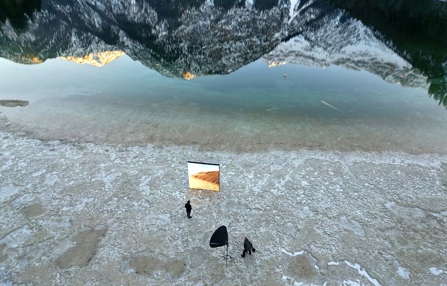 Die Aufnahmen entstehen dort, wo es unbequem wird – draußen in den Tiroler Alpen. Bei eisigen Temperaturen, Wind und Widerstand. Der Rahmen wird vor Ort aufgebaut, die verschiedenen Bannermotive händisch eingespannt. Keine Projektion, kein Studio, sondern reales Gelände.