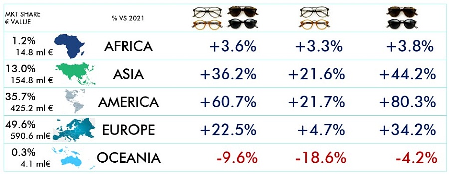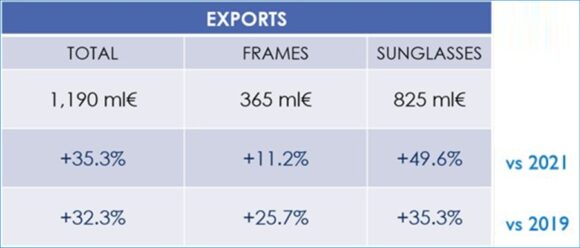 Die Exporte, die etwa 90 % der Produktion des Sektors ausmachten, beliefen sich auf 1.190 Millionen Euro, was einem Anstieg von 35,3 % gegenüber dem gleichen Zeitraum im Jahr 2021 und 32,3 % gegenüber 2019 entspricht. Diese Beschleunigung betraf insbesondere das Segment der Sonnenbrillen, deren Exporte von Januar bis März 2022 sich im Vergleich zum Vorjahr fast verdoppelt haben.