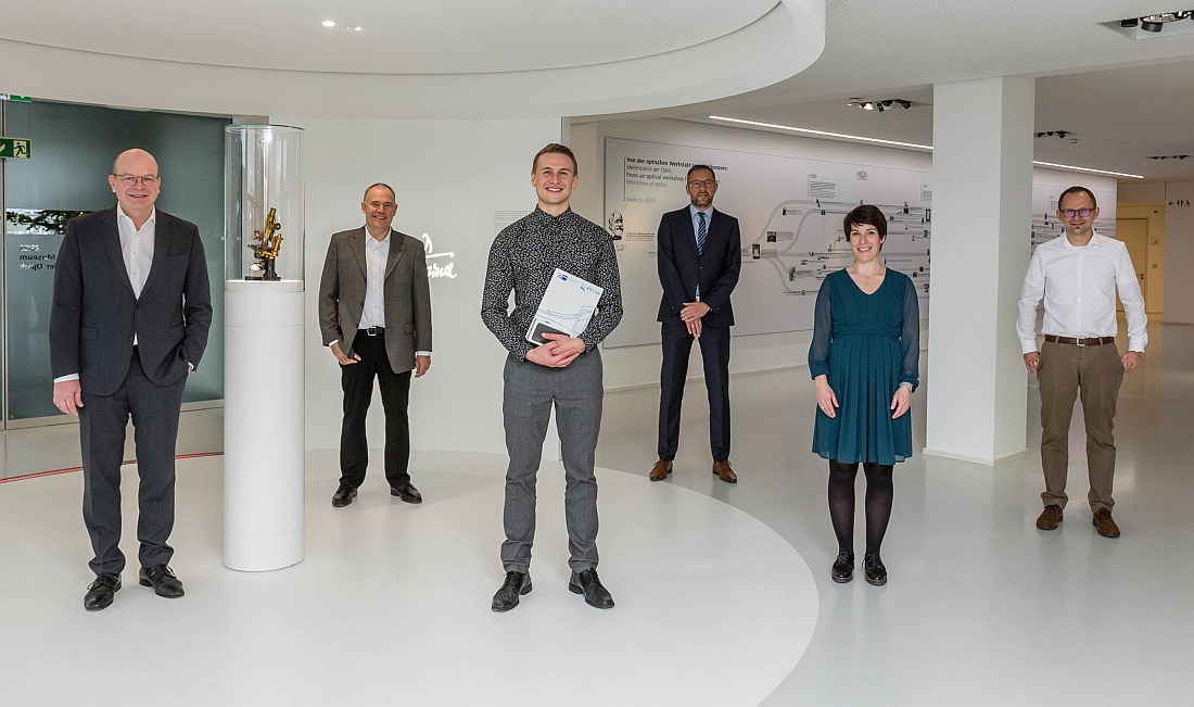 Dominik Elser (Mitte) wurde für seine Leistungen während der Ausbildung in Oberkochen vom DIHK als „Bundesbester Feinoptiker“ ausgezeichnet. Auf dem Foto zu sehen (von links): Dr. Matthias Metz (Mitglied des Vorstands der Zeiss Gruppe), Udo Schlickenrieder (Leiter der Zeiss-Berufsausbildung), Dominik Elser, Thorsten Drescher (stellvertretender Hauptgeschäftsführer der Industrie- und Handelskammer Ostwürttemberg), Nora Schneider (Leiterin Talent Attraction & Workforce Management bei Zeiss) und Roman Janzen (Teamleiter Technische Ausbildung bei Zeiss) (Bild: Zeiss)