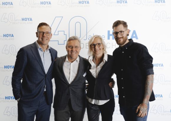 40 Jahre Hoya Lens in Deutschland (von links): Erik Meijer (Fußball-Experte & Sky-Kommentator), Oliver Fischbach (Vice President Commercial West Europe, Hoya), Mirjam Rösch (Geschäftsführerin, Hoya Deutschland) und Philipp Steuer (YouTuber, Blogger, Influencer) (Bild: Hoya)