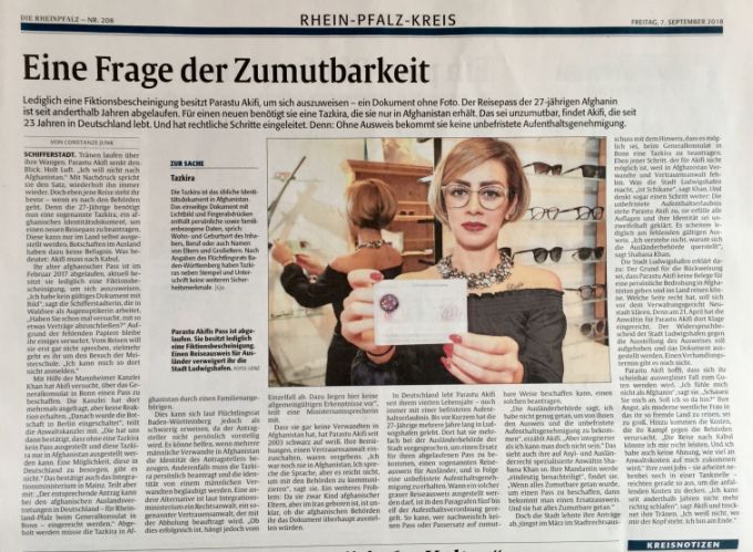 „Eine Frage der Zumutbarkeit“ titelte die Zeitung „Die Rheinpfalz“ am 7. September in ihrem Artikel über die Afghanin Parastu Akifi. Die 27-Jährige lebt seit mehr als 20 Jahren in Deutschland und arbeitet als Augenoptikerin in Waldsee. Ein neuer Pass wird ihr aufgrund fehlender Papiere aus Afghanistan von den deutschen Behörden verwehrt. Doch ist es nicht eher eine Frage der Unmöglichkeit? Denn nach unseren Recherchen ist es nicht realistisch, dass die ausgelernte Augenoptikerin in Afghanistan eine Tazkira (Geburtsurkunde, Identitätsnachweis) erhalten würde. Und die Frage, wie sie ohne gültigen Identifikationsnachweis überhaupt nach Afghanistan reisen soll, hat sich scheinbar niemand gestellt.