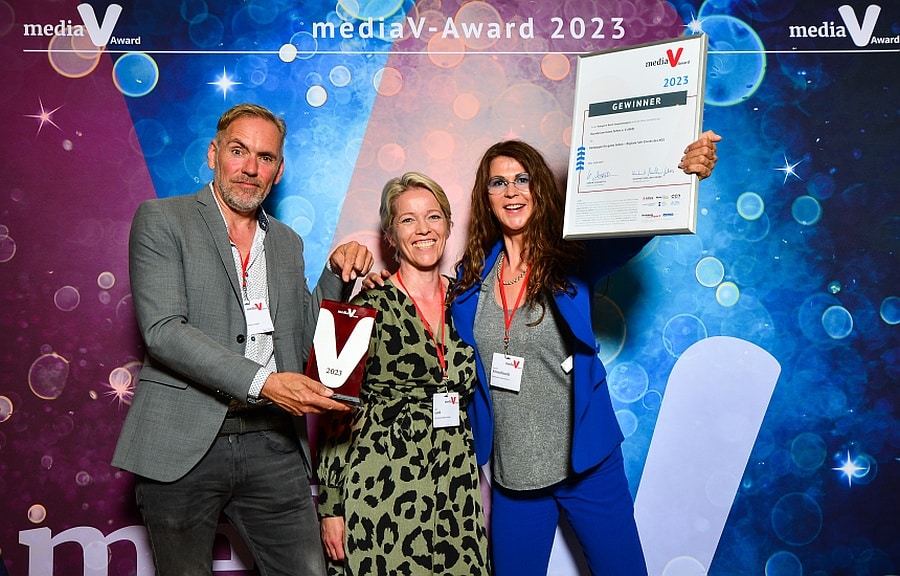 Glückliche Preisträger des mediaV-Award 2023 (von links): Martin Kitz und Anne-Lena Laub von kitz.kommunikation sowie Kerstin Kruschinski vom KGS (Bild: Studio Stefan Wernz / mediaV-Award)