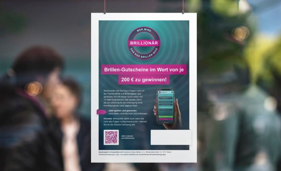 Das Quiz „Wer wird Brillionär?“ wurde als Web-App gestaltet und ist über eine entsprechende Landingpage zugänglich. Um eine möglichst große Anzahl von Teilnehmenden zu erreichen, wird die Aktion auf stark frequentierten Internetseiten und Social-Media-Kanälen beworben. Auch Augenoptik-Betriebe profitieren von der gesteigerten Aufmerksamkeit.