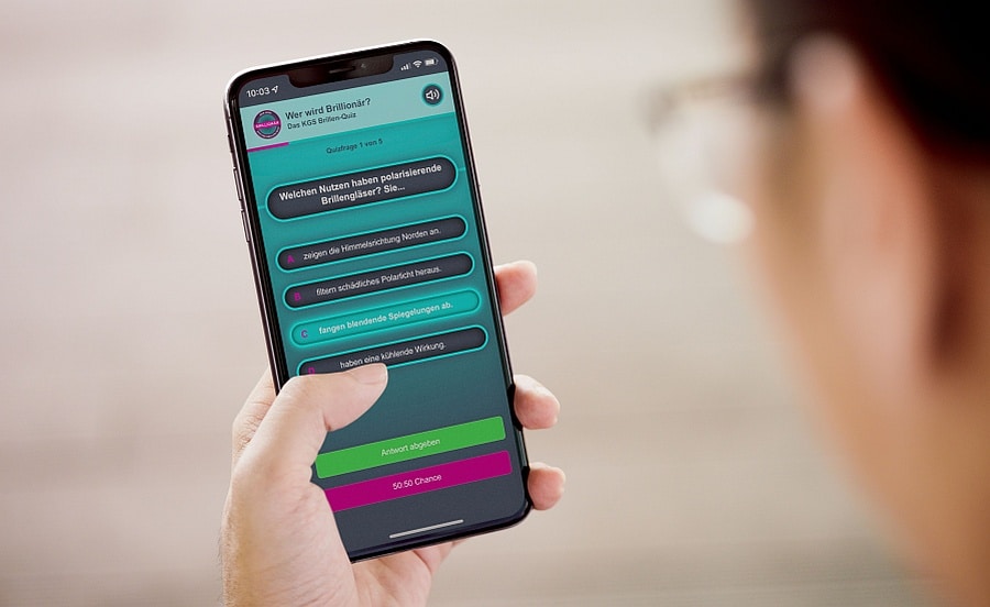 Das komplexe Produkt Brillenglas, sei es Gleitsicht, phototrop oder polarisierend, stellt für viele eine Herausforderung dar. Genau hier setzt das KGS-Quiz an, das mit einer Mischung aus Humor und Spannung die verschiedenen Brillen- und Glas-Eigenschaften verständlich erklärt. Es müssen fünf Fragen mit jeweils vier Antwort-Möglichkeiten aus einem Pool von 15 Fragen beantwortet werden. 2022 wurden über 77 Prozent aller Augenoptiker-Suchen im Kampagnen-Zeitraum durch das Brillen-Quiz ausgelöst. Mehr als 15.000 Menschen haben daran teilgenommen.