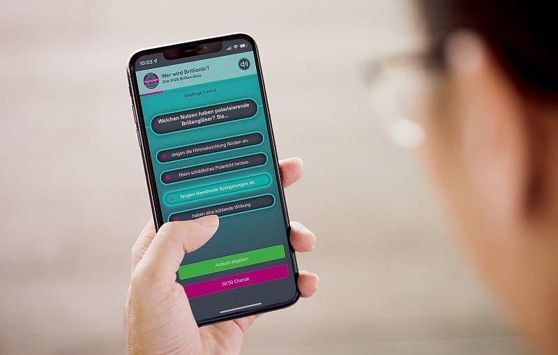 Welche Vorteile haben phototrope Brillen? Wovor schützen polarisierende Shields? Was können Low-Add-Power-Gläser? Fragen, auf die die meisten Menschen keine Antwort parat haben. Mit dem Gläser-Quiz „Wer wird Brillionär?“ nutzt das KGS eine uralte, menschliche Leidenschaft – das Rätselraten. Weil der Mensch am liebsten spielerisch lernt, werden die Teilnehmenden animiert, sich mit Brillengläsern und deren Hightech-Eigenschaften zu beschäftigen. Die 15 Fragen und ihre Multiple-Choice-Antworten erinnern an beliebte TV-Shows.