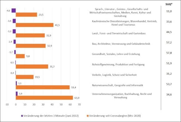 Im dritten Quartal 2022 sank laut KOFA-Report die Zahl der offenen Stellen für qualifizierte Bewerberinnen und Bewerber in fast allen Berufsbereichen. Der deutlichste Rückgang mit 4,6 Prozent zeigte sich im Bereich „Sprach-, Literatur-, Geistes-, Gesellschafts- und Wirtschaftswissenschaften, Medien, Kunst, Kultur und Gestaltung“, gefolgt von „Kaufmännische Dienstleistungen, Warenhandel, Vertrieb, Hotel und Tourismus“ mit einem Rückgang von 3,4 Prozent.