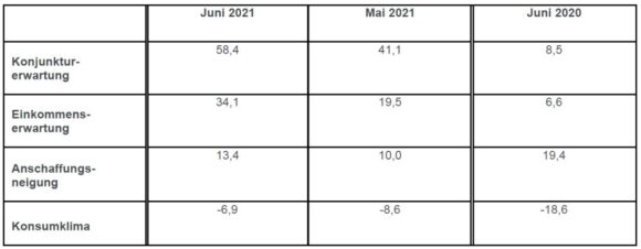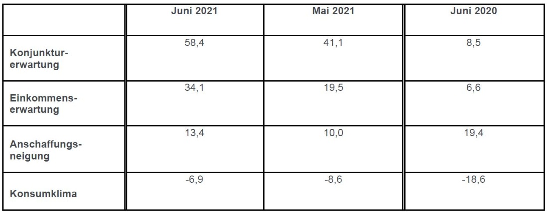 Konsumklima: Indikatoren Juni 2021 (Quelle: GfK)
