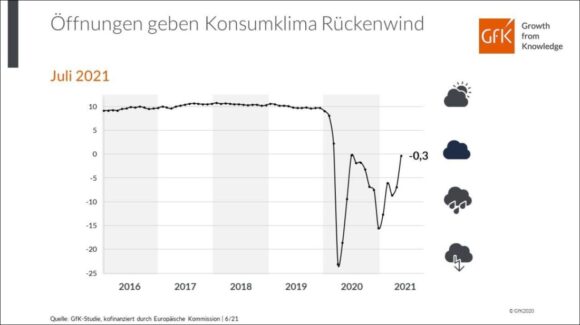 Rolf Bürkl, GfK-Konsumexperte, dazu: „Wir lassen den Lockdown mehr und mehr hinter uns. Stark sinkende Inzidenzen sowie signifikante Fortschritte beim Impfen erlauben immer umfangreichere Lockerungen bzw. Öffnungen. Zudem ist nun auch Urlaub wieder möglich. Dies sorgt für steigenden Optimismus, der sich auch in der besseren Konsumstimmung ausdrückt. So prognostizieren wir für das Konsumklima für Juli einen Wert von -0,3 Punkten und damit den höchsten Wert seit Sommer vergangenen Jahres. Im August 2020 wurde mit -0,2 Punkten zuletzt ein besserer Wert gemessen.“