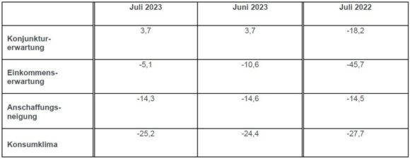 Im Gegensatz zu den Einkommens-Aussichten konnte die Anschaffungs-Neigung kaum zulegen. Der Indikator gewann marginale 0,3 Zähler hinzu und weist aktuell –14,3 Punkte auf. Er liegt damit fast auf dem gleichen Niveau wie im Vorjahr (Juli 2022: –14,5 Punkte).