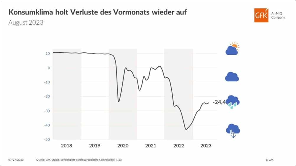 Die Stagnation der Konsum-Neigung auf niedrigem Niveau sei laut GfK auf die anhaltend große Verunsicherung der Verbraucher zurückzuführen. Hohe Lebensmittel- und Energiepreise, der anhaltende Ukraine-Krieg sowie die Sorgen vor steigenden Kosten durch Sanierungs-Maßnahmen für Immobilien als Folge des Heizungsgesetzes veranlassten die Verbraucher, mit ihren geplanten Anschaffungen derzeit vorsichtiger umzugehen.