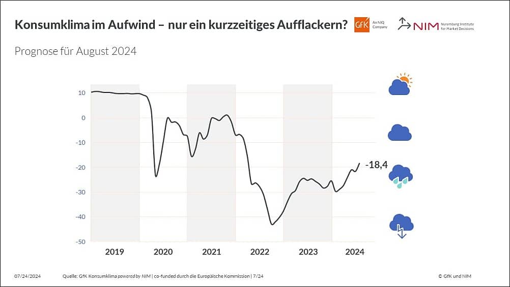 Das Konsumklima in Deutschland hat sich im Juli spürbar verbessert und konnte sich deutlich erholen: Der Indikator vom GfK Konsumklima powered by NIM (Nürnberg) steigt in der Prognose für August im Vergleich zum Vormonat (revidiert –21,6 Punkte) um 3,2 Zähler auf –18,4 Punkte.