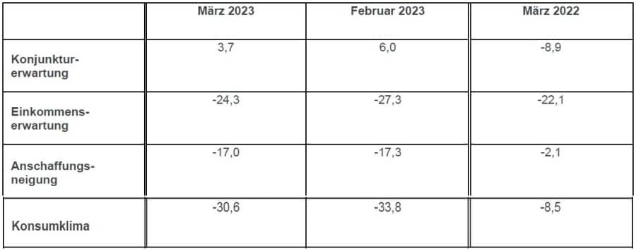 Der erneute Anstieg beim Konsumklima sei in erster Linie auf die positive Entwicklung der Einkommens-Aussichten zurückzuführen. Zum sechsten Mal in Folge konnte der Indikator ein Plus verzeichnen und stieg im März um drei Zähler auf –24,3 Punkte. Dies ist der beste Wert seit zehn Monaten, seit er im Mai 2022 bei –23,7 Punkten lag. Trotz des positiven Trends bleibt das Niveau der Einkommens-Erwartung ausgesprochen niedrig.