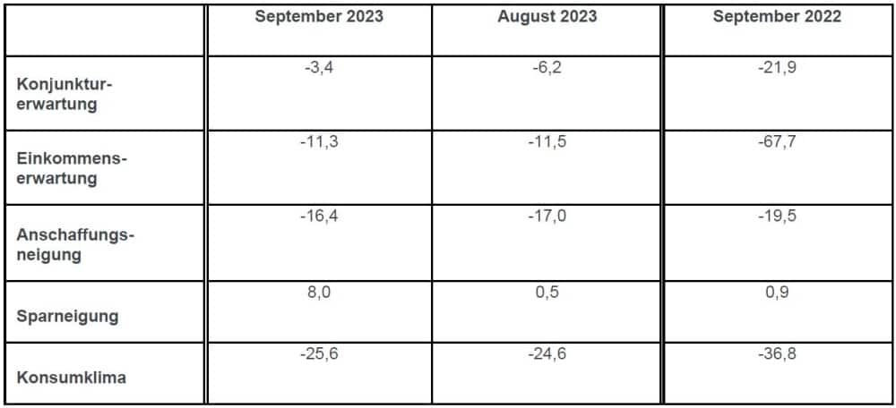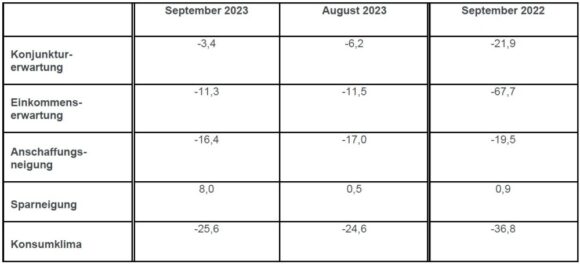 Werte der einzelnen Indikatoren im September im Vergleich zum Vormonat und Vorjahr (Quelle: GfK Nürnberg)