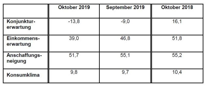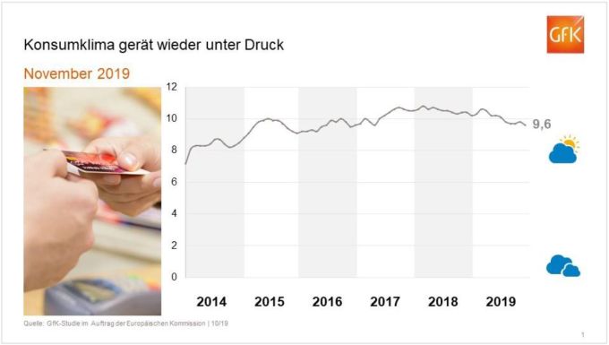 (Nürnberg) – Die Stimmung der Verbraucher zeigt im Oktober ein weniger optimistisches Bild. Sowohl die Konjunktur- und Einkommenserwartung wie auch die Anschaffungsneigung müssen Einbußen hinnehmen. Für November prognostiziert GfK für das Konsumklima einen Wert von 9,6 Punkten und damit 0,2 Zähler weniger als der revidierte Oktober-Wert (9,8 Punkte). Das sind Ergebnisse der GfK-Konsumklima-Studie für Oktober 2019.