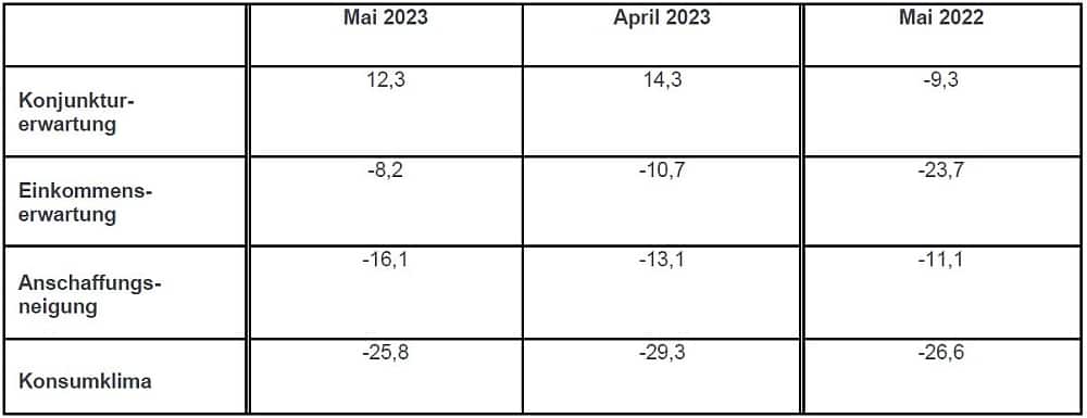 Eine weitere wesentliche Stütze für die leichte Konsumklima-Erholung war die Einkommens-Erwartung. Der Einkommens-Indikator legte im Mai ebenfalls zum achten Mal in Folge zu und kletterte nach Zuwächsen von 2,5 Punkten auf –8,2 Zähler. Im Vergleich zum entsprechenden Zeitraum des Vorjahres ist dies immerhin ein Plus von 15,5 Punkten.
