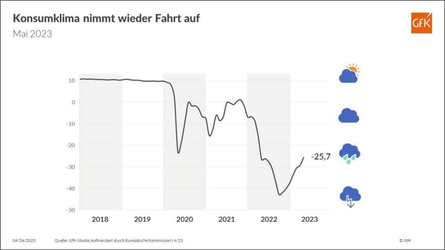 Das Konsumklima in Deutschland hellte sich im April spürbar auf. Konjunktur- und Einkommens-Erwartung erholten sich deutlich, während die Anschaffungs-Neigung moderate Zugewinne verzeichnete. GfK Nürnberg prognostiziert für das Konsumklima im Mai –25,7 Punkte und damit 3,6 Punkte mehr als im April.