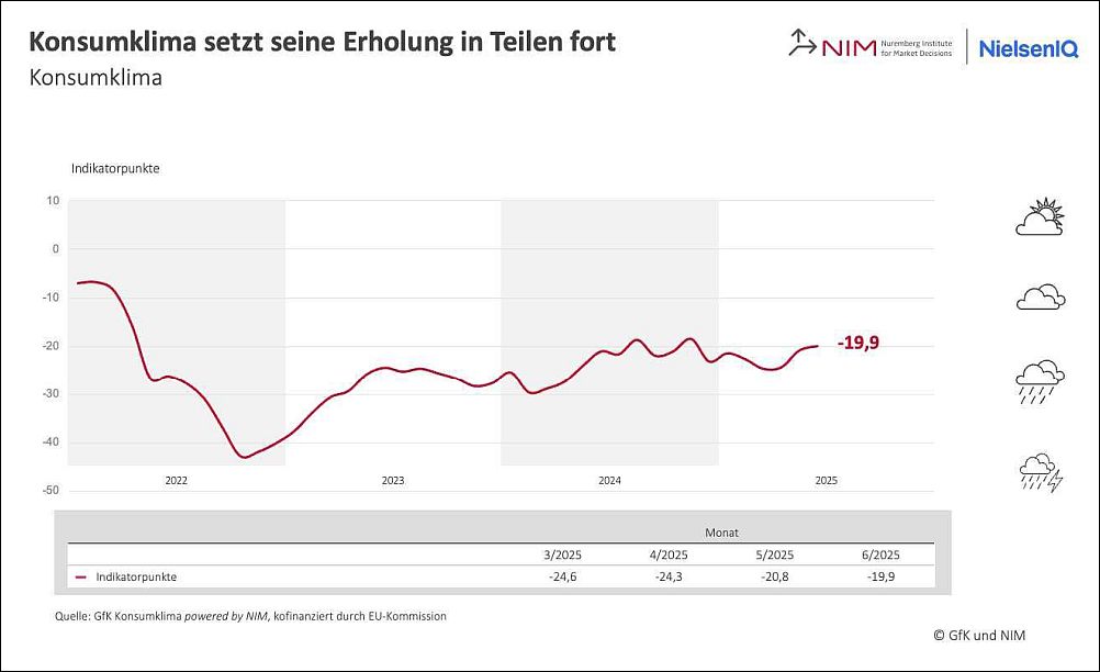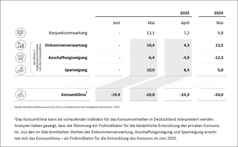 Das Konsumklima zeigte im Mai in Deutschland eine uneinheitliche Entwicklung. Der Konsumklima-Indikator von GfK / NIM (Nürnberg) prognostiziert für den Juni 2025 im Vergleich zum Vormonat (revidiert –20,8 Zähler) einen moderaten Anstieg um 0,9 Zähler auf –19,9 Punkte.