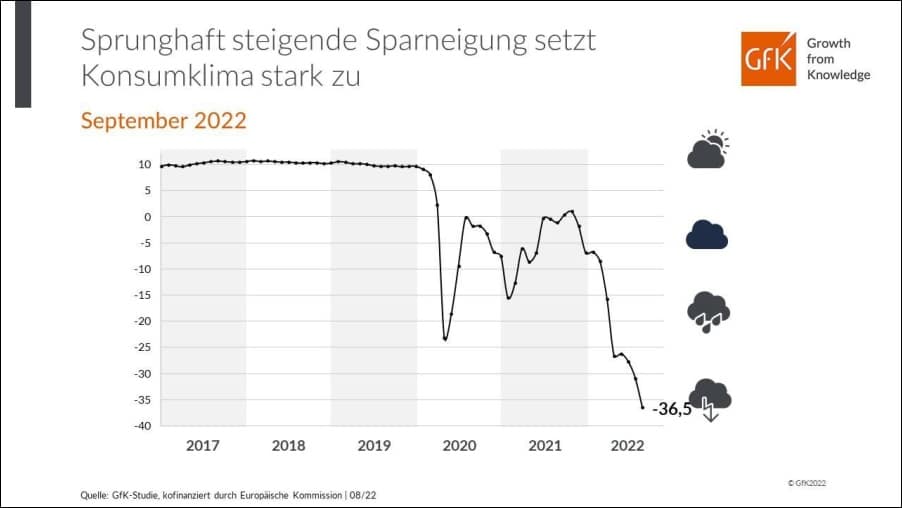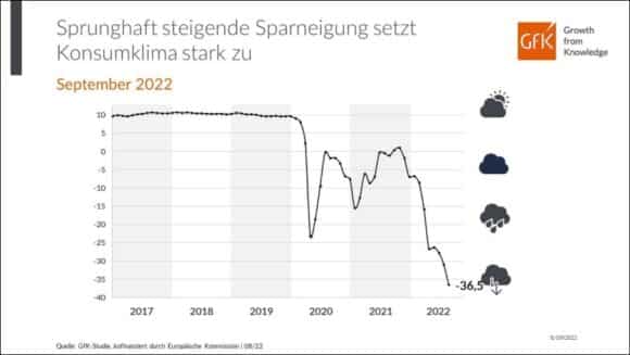 „Der sprunghafte Anstieg der Sparneigung in diesem Monat lässt das Konsumklima seine steile Talfahrt fortsetzen. Es erreicht zum wiederholten Male ein neues Rekordtief“, erklärt Rolf Bürkl, GfK-Konsumexperte. „Die Furcht vor deutlich höheren Energiekosten in den kommenden Monaten zwingt viele Haushalte zur Vorsorge und dazu, Geld für zukünftige Energie-Rechnungen auf die Seite zu legen. Dies belastet das Konsumklima weiter, da im Gegenzug weniger finanzielle Mittel für den übrigen Konsum zur Verfügung stehen“.