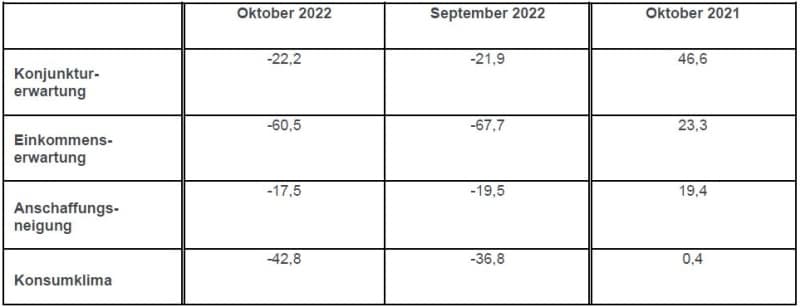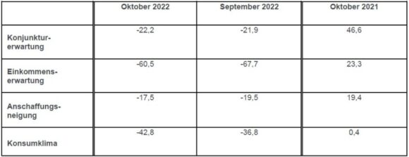 Im Gegensatz zur Einkommens-Erwartung und Anschaffungs-Neigung konnte die Konjunktur-Erwartung im Oktober nicht zulegen. Der Indikator verlor minimale 0,3 Zähler und sank damit auf –22,2 Punkte. Im Vergleich zu Oktober 2021 beträgt das Minus knapp 69 Punkte.