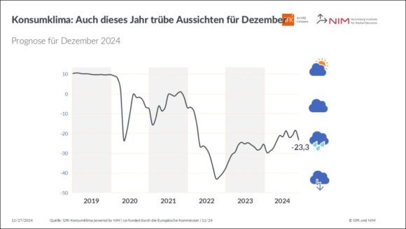 „Die letzten Wochen des Jahres enden mit einem deutlichen Rückschlag beim Konsumklima. Die für Dezember gemessenen –23,3 Punkte sind der tiefste Stand seit Mai dieses Jahres (Mai 2024: –24 Zähler). Die Konsumstimmung im Land befindet sich aktuell also auf einem vergleichbar niedrigen Niveau wie Ende 2023“, erklärt Rolf Bürkl, Konsumexperte beim NIM.